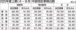 中部地区2025年度上期(4~9月)の継続検査(車検)台数(登録車+軽自動車)は、前年同期比3.2%増の249万7100台だった(中部運輸局自動車技術安全部調べ)。上期としては2年ぶりの増加だ。登録車は同2.2%増の156万1800台、軽自動車は同5.0%増の93万5300台だった。民間整備工場で車検を行う指定整備台数は、登録車が同1.4%増の1…
