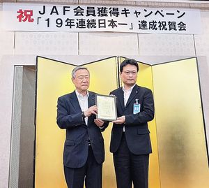 【松江】日本自動車連盟(JAF)島根支部(野々村健造支部長)は、2025年6~7月に開催された「日産自動車販売協会JAF入会促進キャンペーン」で、島根日産(櫻井誠己社長)が19連覇を達成したことを記念し松江市内で祝賀会を行った。同キャンペーンは、全国の日産系ディーラーがJAF新規入会の目標達成率・獲得件数を競うもので、同社は目標達成率部門で達成率…
