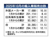 日本自動車輸入組合(JAIA、ゲルティンガー剛理事長)が11月7日に発表した2025年10月の外国メーカー車の新規登録台数は、前年同月比10.9%増の1万7688台となり、10カ月連続で増加した。登録車全体に占める外国メーカー車のシェアは7.1%だった。また、電気自動車(EV)は同34.4%増の2562台で、24年11月以降12カ月連続で増加。外国メーカー車に占めるEVの割合は、同2.5ポイント増の14.5%だった。