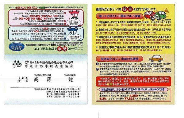 【帯広】自販連帯広支部(髙薄健支部長)は、エコカー補助金終了で減速した新車販売を早期回復に導こうと、各社共通のPR名刺による代替促進活動をスタートした。PR名刺作戦は昨春に続いて2度目。同地区でエコカー補助金のスクラップインセンティブを利...