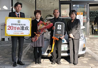 【松山】トヨタカローラ愛媛(五味久枝社長、松山市中央)は1日、松山市の本社で「新車販売累計20万台記念納車セレモニー」を開催した。1966年1月の同社設立から46年2カ月での達成で、愛媛県内で累計20万台は珍しい。 半数の10万台に90年...